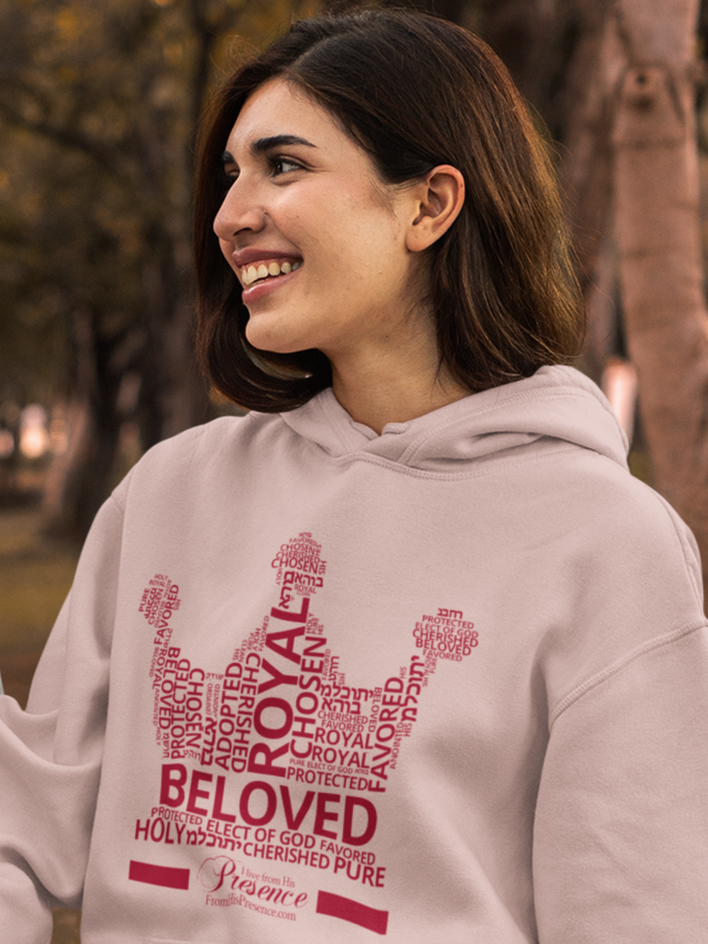 The word cloud contains words like ROYAL, BELOVED, HOLY, CHOSEN, CHERISHED, PURE, FAVORED, ADOPTED in English AND some in Hebrew as well. At the bottom of the word cloud, in the part that looks like the crown's velvet rim, it says "I live from His Presence" with FromHisPresence.com written in small lettering under that.